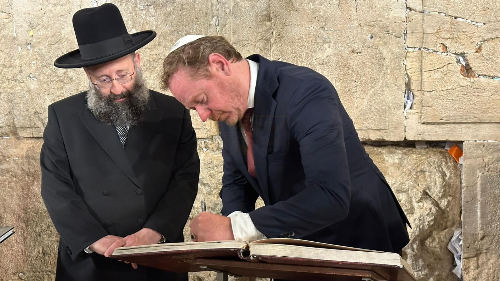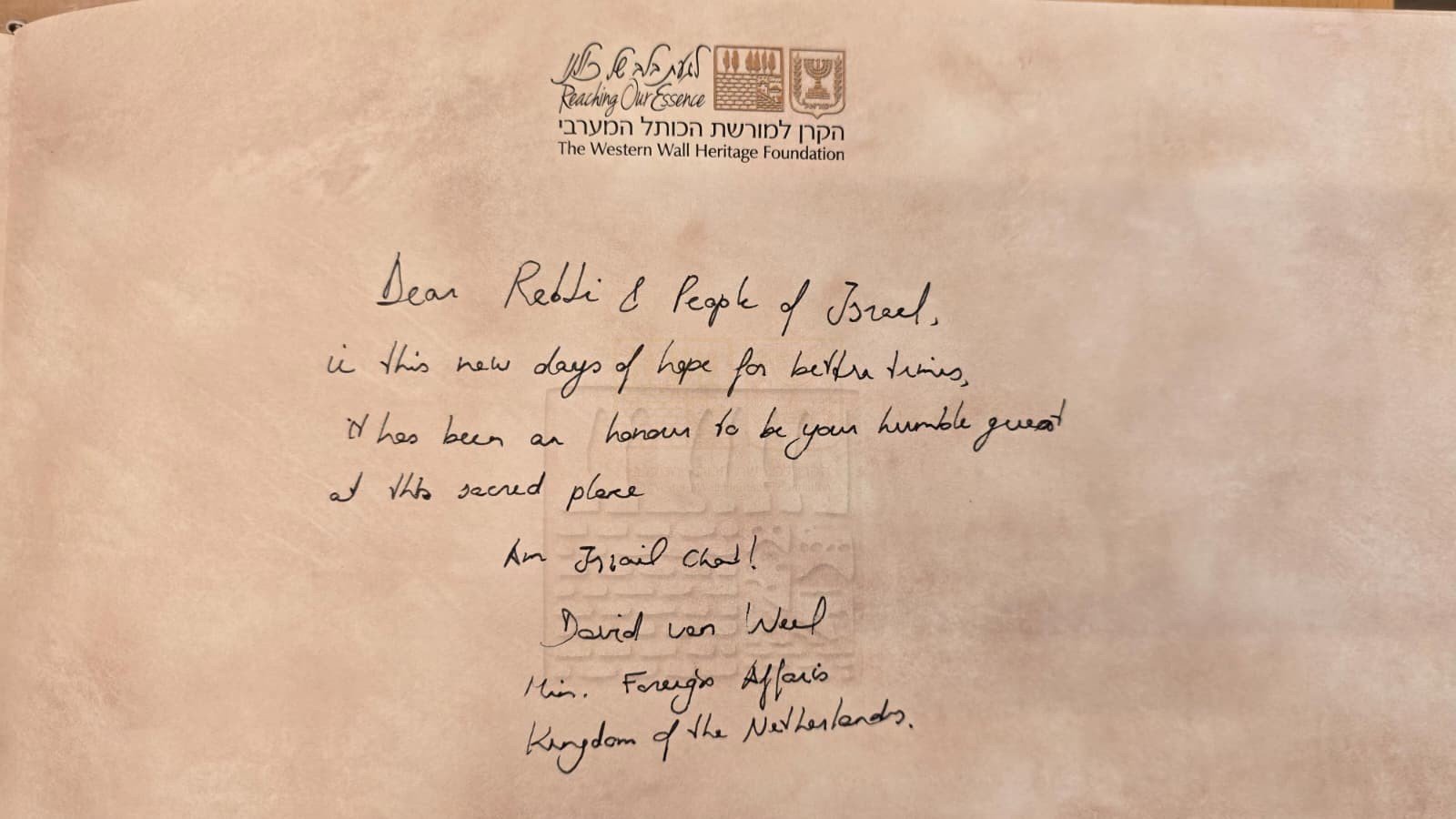 At the end of the visit, the foreign minister wrote a personal note and placed it between the stones of the Wall. He then toured the new Gateway to Heaven exhibit recently opened to the public in the Western Wall Tunnels and concluded his visit to the Western Wall by signing the guest book with the words: