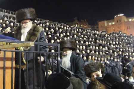 The Admor of Skverer, Rabbi David Twersky, arrived at the Western Wall after midnight on Saturday night, the week of Parshat Va’era. He was accompanied by thousands of chasidim, including 1,500 who came with him from the U.S. and Europe despite the security situation. For more than two hours the Admor and his followers prayed for the welfare and safety of the Jewish people.