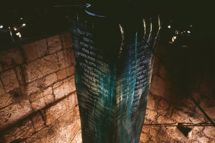 מתחת לרצפת הזכוכית נראים קיר מימי הבית הראשון, מקווה טהרה מתקופת החשמונאים ותעלה רומית מימי חורבן הבית השני. וכאן, מתוך עברה הרחוק של ירושלים מיתמר עמוד עצום העשוי מ-2000 שכבות של זכוכית, כשכל שכבה מסמלת עוד שנה של גלות – ושל כיסופים.